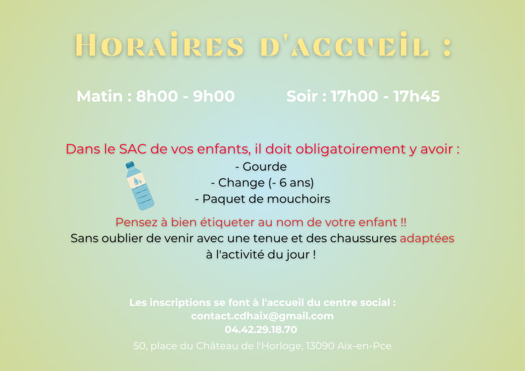 ♦ Accueil pendant les vacances scolaires du lundi au vendredi de 8h à 17h45. - L’ouverture des portes se fait de 8h à 9h, de 13h15 à 13h30, puis de 17h à 17h45.